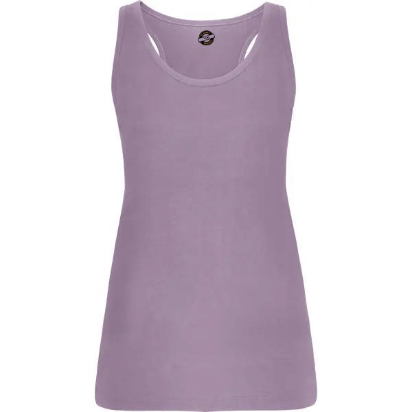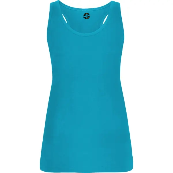 Camiseta entallada, con sisas y escote ribeteado, ancho y enrollado. Espalda estilo nadadora y costuras laterales.