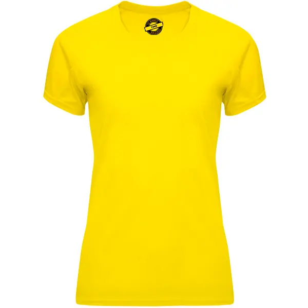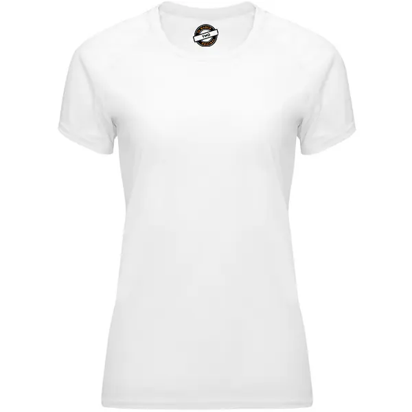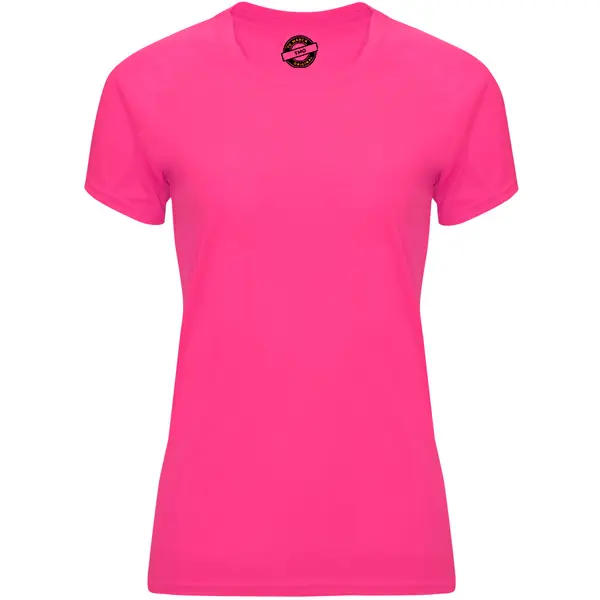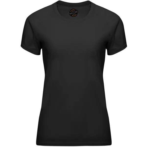 Camiseta técnica entallada de manga corta ranglán para mujer, con cuello redondo y cubrecosturas a tono. Paneles inferiores en mangas. Remallado a tono en sisa y panel de manga. Tejido CONTROL DRY.