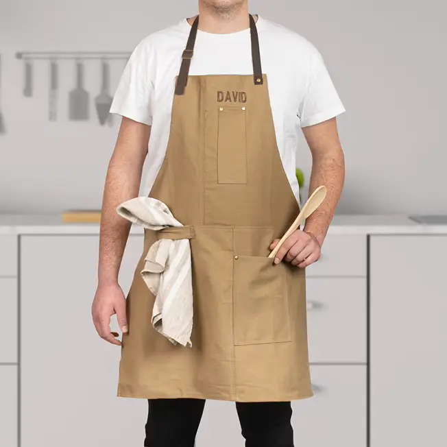 El Delantal marrón bordado es la prenda perfecta para quienes buscan estilo y resistencia en la cocina. Combina diseño sofisticado, comodidad y practicidad en un solo accesorio.