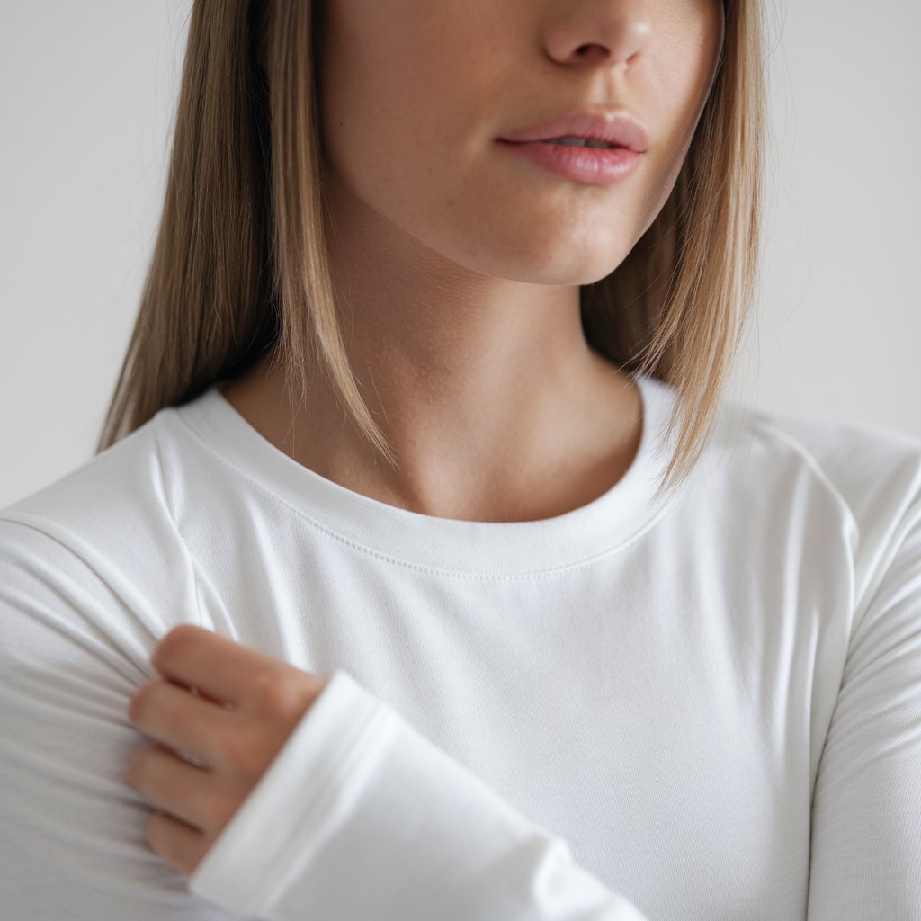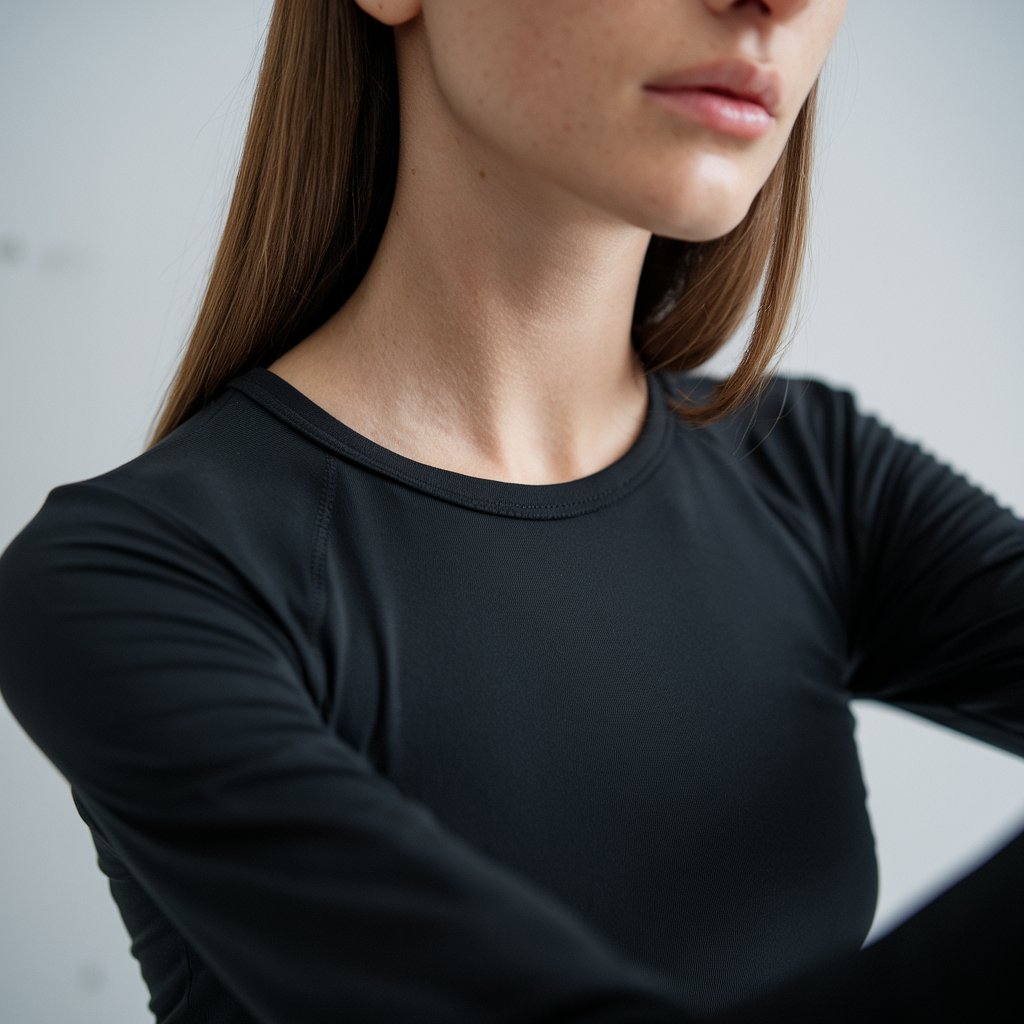Camiseta de manga larga, tejido tubular y cuello redondo de 4 capas. Cubrecosturas de refuerzo en cuello y hombro. Sin puños.