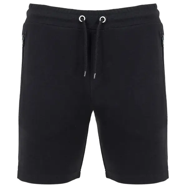 Pantalón corto con cinturilla elástica y cordón con ojales metálicos. Dos bolsillos laterales con cremalleras invertida a tono y tirador. Banda lateral a tono. Adorno de bragueta cosida. Un bolsillo trasero con broche de presión.